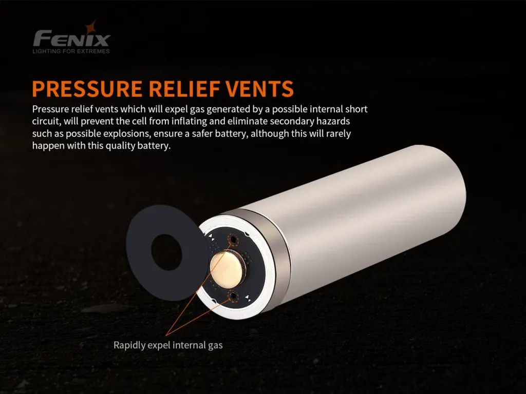 The Fenix ARB-L21-5000 V2.0 is a high capacity 21700 Li-ion rechargeable battery with a protection circuit in the anode to help prevent short circuits, over charge/discharge and over heating. The battery also includes pressure relief vents which expel waste gas in the rare case of an internal short circuit preventing an explosion.