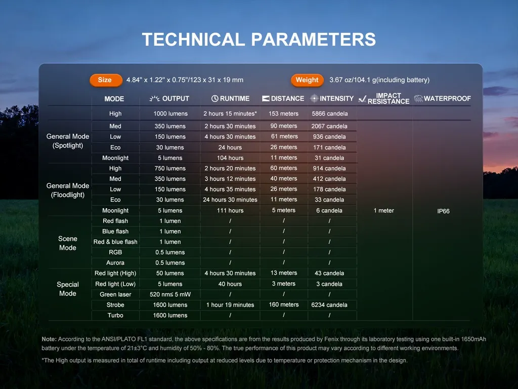 - 1600 lumens maximum output with 160-meter beam reach across adjustable spot and flood modes