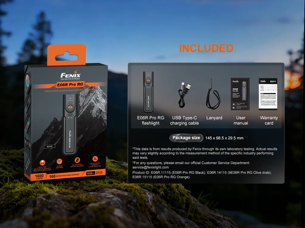The Fenix E06R Pro RG is a high-performance, multifunctional flashlight engineered with an innovative triple-light-source system. It combines a blistering 1600-lumen white light with a red light (5-50lm) designed to preserve night vision, and a versatile green laser, ideal for presentations, stargazing, and outdoor guidance. Its adjustable spotlight and floodlight, with a max beam distance exceeding 160 meters, master the lighting demands of everything from daily commuting to outdoor adventures. An intuitive dual-switch control system, complemented by individual light source switches, ensures intuitive operation. Equipped with a built-in 1650mAh rechargeable battery and USB Type-C charging, it achieves an exceptional maximum runtime of up to 111 hours in Eco mode, while the battery level indicator and low-voltage warning keep you informed of the remaining charge. Rigorously tested to meet IP66 protection standards and crafted with precision engineering, it ensures lasting durability in various environments.