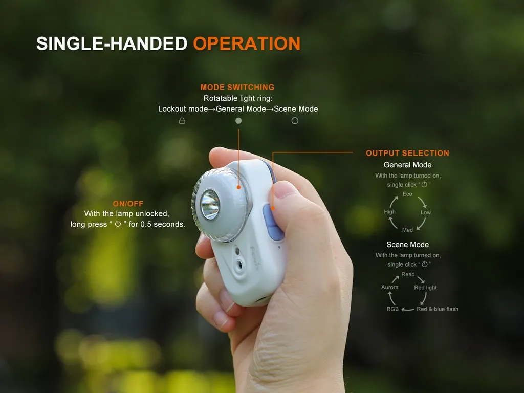 The Fenix HL17R is an ultralight magnetic gear that functions as both a headlamp and a flashlight. Made of high-strength plastic, it is durable and dependable for various uses. For convenience, it comes with a quick-release mount and a magnetic back clip and can be worn on the head, held in hand, or attached to the chest or metal surfaces. In addition, it features four brightness levels of white light and five atmospheric lighting effects, which, combined with the gesture sensing function, provide snug vibes, add extra fun, and improve safety at campsites. Let every journey be filled with warmth and wonder through the enchanting illumination of HL17R.