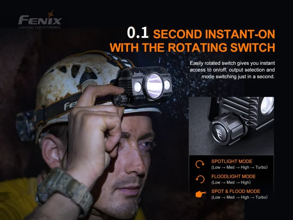 The upgraded version Fenix HP30R V2.0 is a rechargeable high-performance separate headlamp. The power comes from the two included 21700 rechargeable batteries that allow for extended runtime in an easy-to-recharge case with the unique ability to also charge your other digital devices as a power bank. The 3 unique LED’s can all be used at once to disperse an amazing 3000 lumens that reaches over 270 meters. The versatility of this headlamp begins with the belt-worn battery case that allows for lightweight and comfortable design on the head. The unique ability to utilize both flood and spot levels at once provides you adaptable light. The HP30R V2.0 can be a life-saving tool to search and rescue professionals.